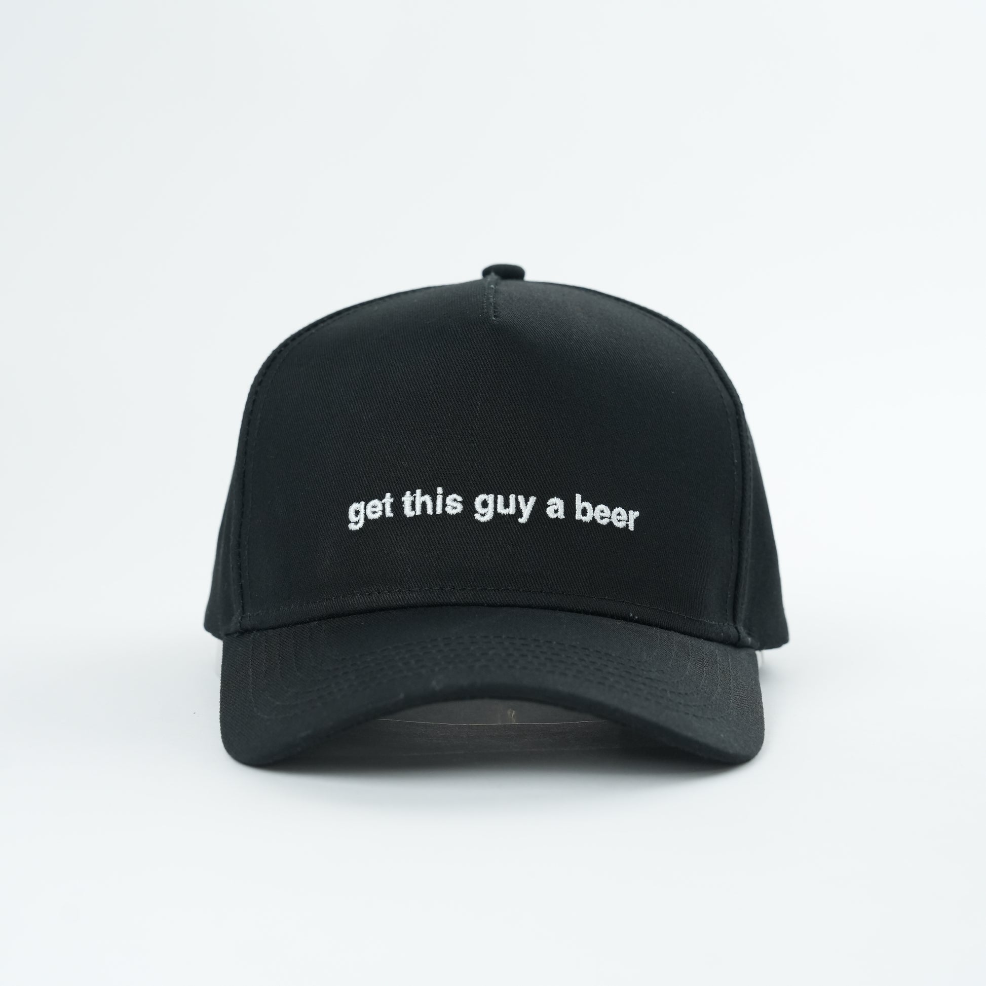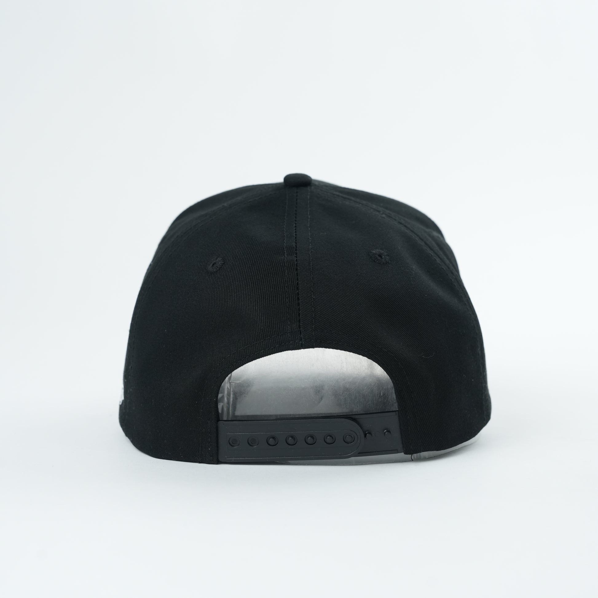 A structured black cotton 5-panel cap with sharp white embroidery that does the talking for you. Secured with a classic snapback for a no-fuss fit. Minimal design meets playful edge - for afternoons that accidentally turn into evenings.
